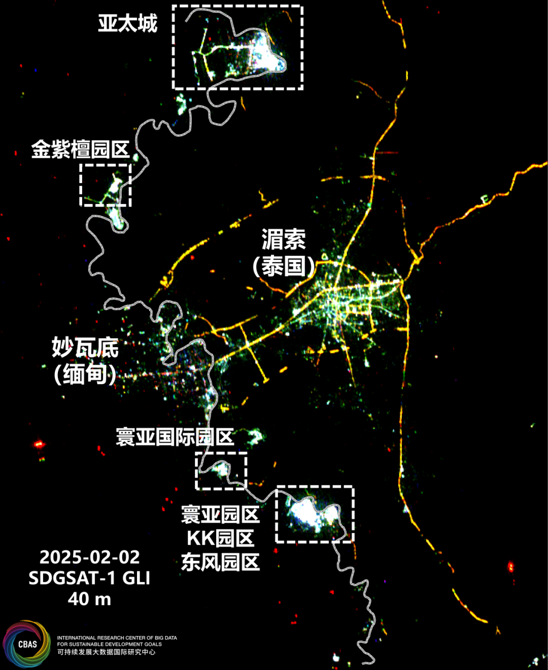 泰国政府实行“三断”之后,SDGSAT-1卫星于2月20日拍摄的妙瓦底地区微光卫星影像(图片着手:可抓续发展大数据外洋商榷中心)