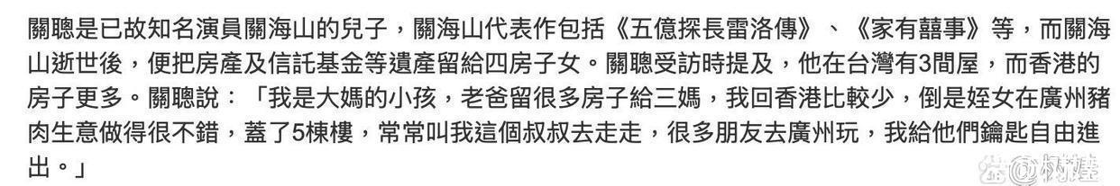 谈及个东说念主近况,关聪暗示如今过的等于退休的舒坦生活,意思神往未几,一个是炒干贝酱,即是XO酱,另一个等于打小麻将,再有等于睡前喝一杯。有东说念主有趣关聪在台湾生活这样多年,不拍戏,又不作念买卖,靠什么生活?本来关聪秉承了父亲关海山的部分遗产,生活才会无忧。关聪是关海山与第二任爱妻所生的男儿,称得上是宗子——关海山有四段婚配,一共有三个女儿,三个男儿,诚然他不是什么大佬官,不外曩昔在文娱圈奔驰多年,也有不少钞票。2006年离世之后,家眷为了争产大打发轫,争得你死我活。不外关聪其时并莫得参与争产,但也赢得了父亲留住的产业。
