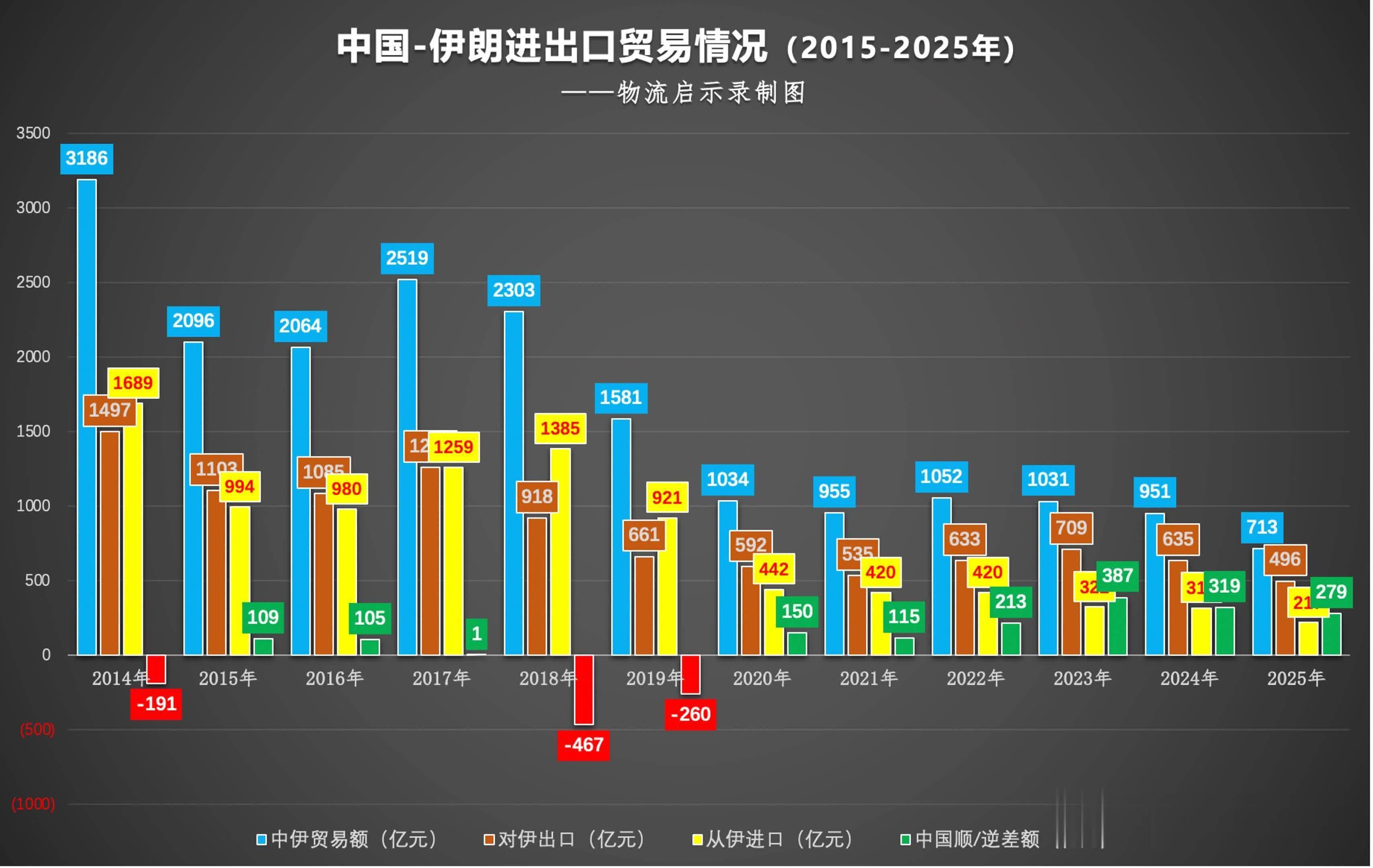 从畴前十年来看,中伊双边交易呈波动性下滑,从2014年的3186亿元降至2019年的1581亿元,之后跌进千亿元水平线,2025年中伊双边交易规模仅为2014年的22.38%,不及十年前的1/4。