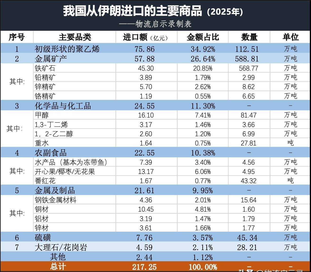 2025年,我国从伊朗入口的商品仅有500余种(按HS8位编码),主要商品量值情况整理如下表: