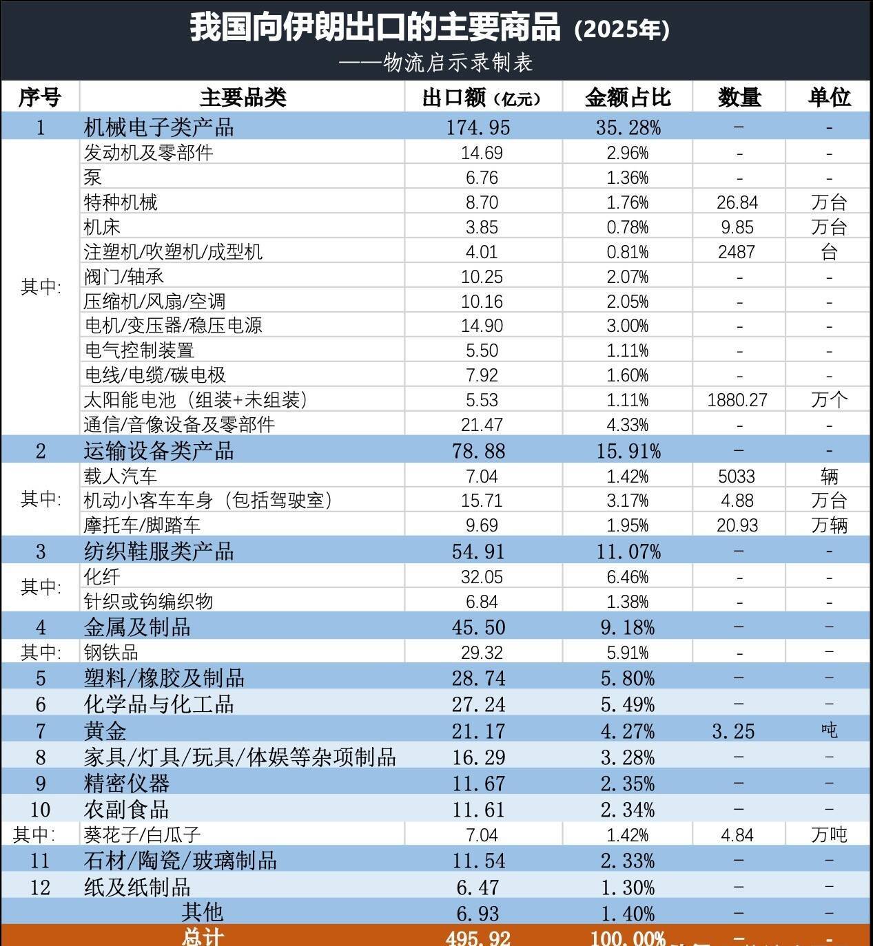 2025年,我国向伊朗出口的商品有4100余种(按HS8位编码),主要商品量值情况整理如下表: