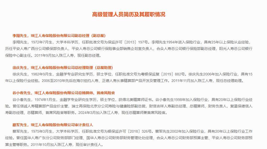 大河财立方记者梳剃头现,戒指咫尺,珠江东说念主寿官网露馅的高管团队仅有4东说念主,包括副总司理李翔、总司理助理徐庆、审计累赘东说念主蔡军以及2024年加入的总精算师兼首席风险官谷小春。其中,除谷小春外,其余多为公司拓荒初期即加入的“元老级”高管。