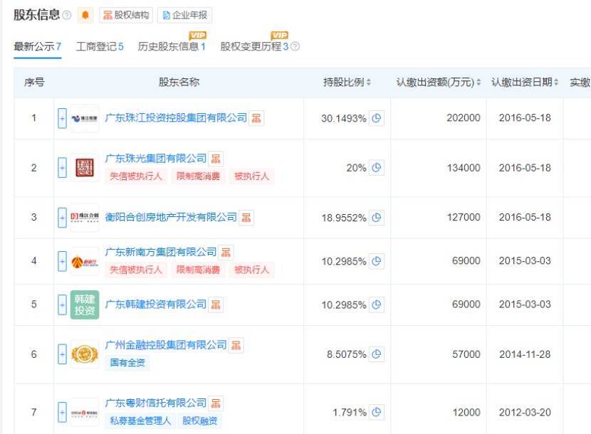 此外,在其主要股东内部,广东珠光集团有限公司(持股20%)、广东新南边集团有限公司(持有10.29%)均被列入失信被实行东说念主、戒指高耗尽。